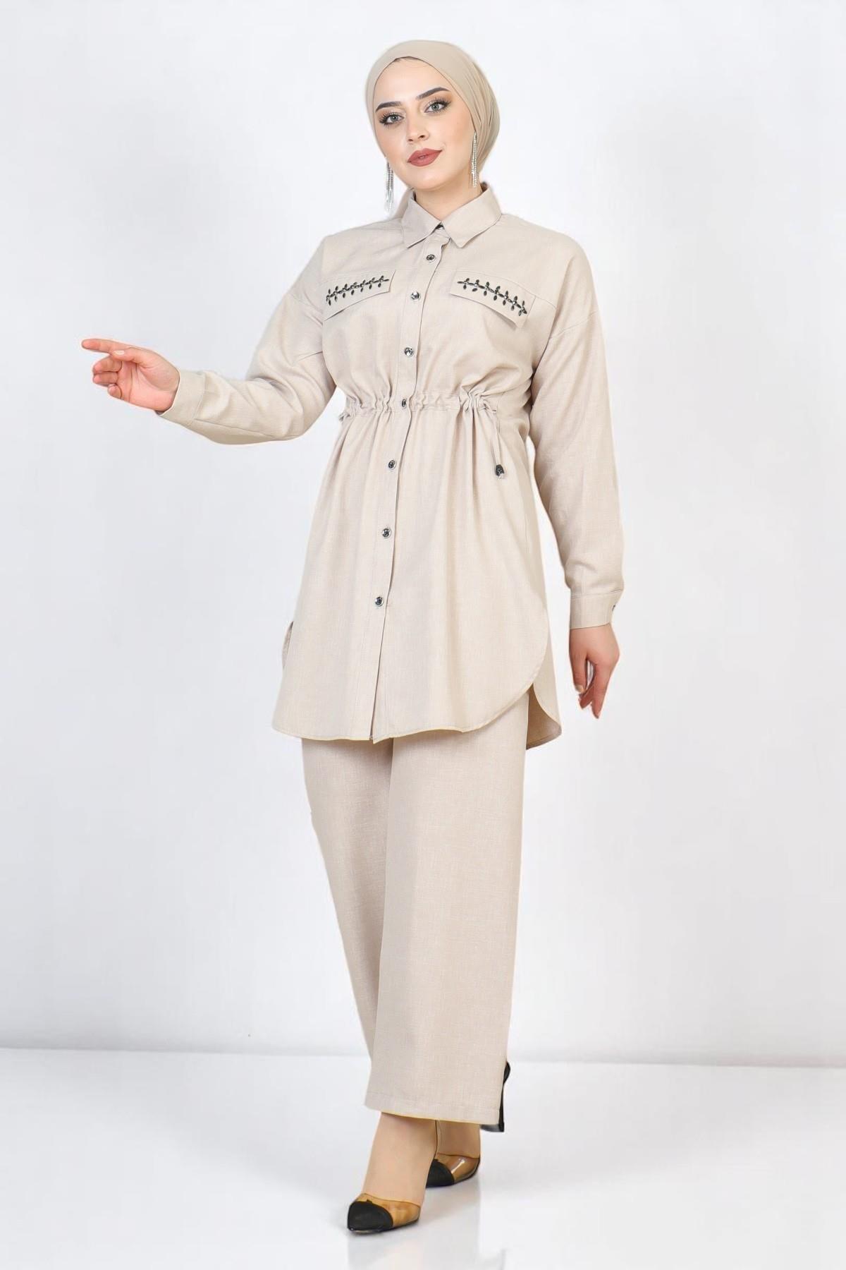 Ürün Özelliği : Yeni sezon tesettür moda ürünüdür. Astarsızdır. Tunik, önden kullanılabilir düğmeleri bulunmaktadır.Beli bağcıklıdır. Manşet düğmeleri aktiftir. Pantolon, beli lastiklidir. Ürün renginde konsept çekimlerinden dolayı ton farklılığı olabilir.