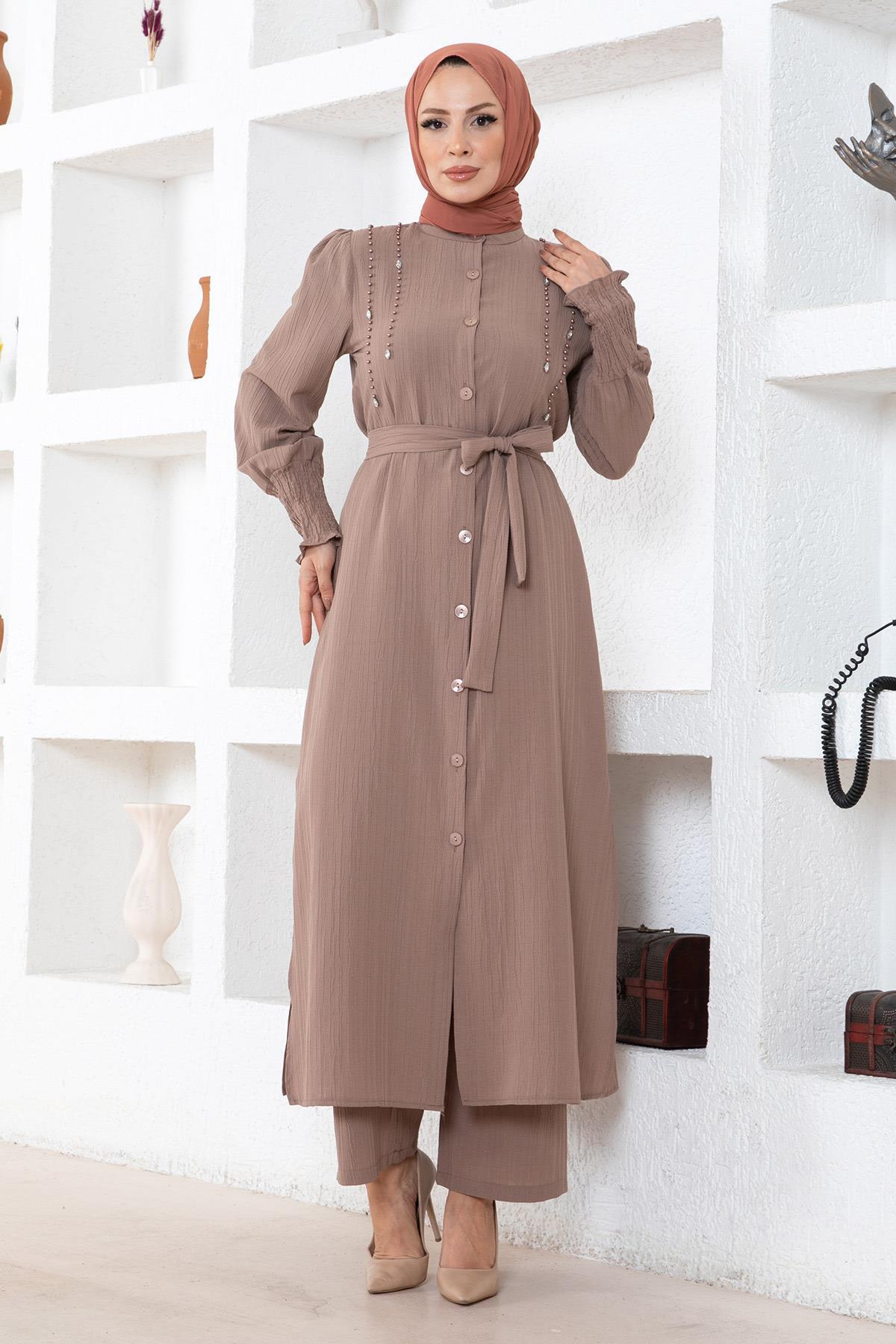 Ürün Özelliği : Yeni sezon tesettür moda ürünüdür. Astarsızdır. Bir beden büyük almanız önerilir. Dar kalıptır. Tunik, önden kullanılabilir düğmeleri bulunmaktadır. İnciler çakımlıdır kopma yapmaz.  Kemeri seyyardır. Yırtmaç detaylıdır. Pantolon, beli lastiklidir. Ürün renginde konsept çekimlerinden dolayı ton farklılığı olabilir.