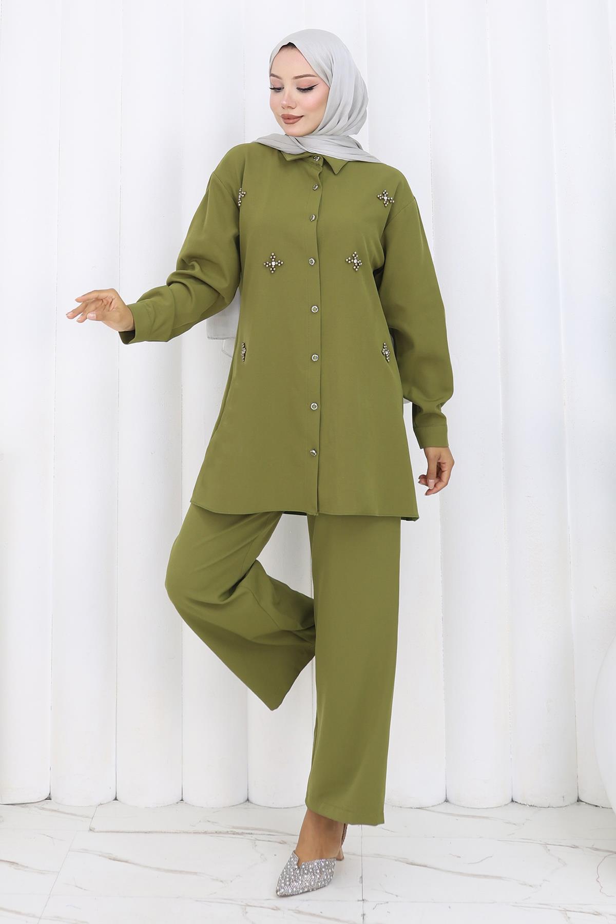 Ürün Özelliği : Yeni sezon tesettür moda ürünüdür. Astarsızdır. Tunik, önden kullanılabilir düğmeleri bulunmaktadır. Taşlar ve inciler baskıdır. Manşet düğmeleri aktiftir. Pantolon, beli arkadan lastiklidir. Cep mevcuttur. Ürün renginde konsept çekimlerinden dolayı ton farklılığı olabilir.