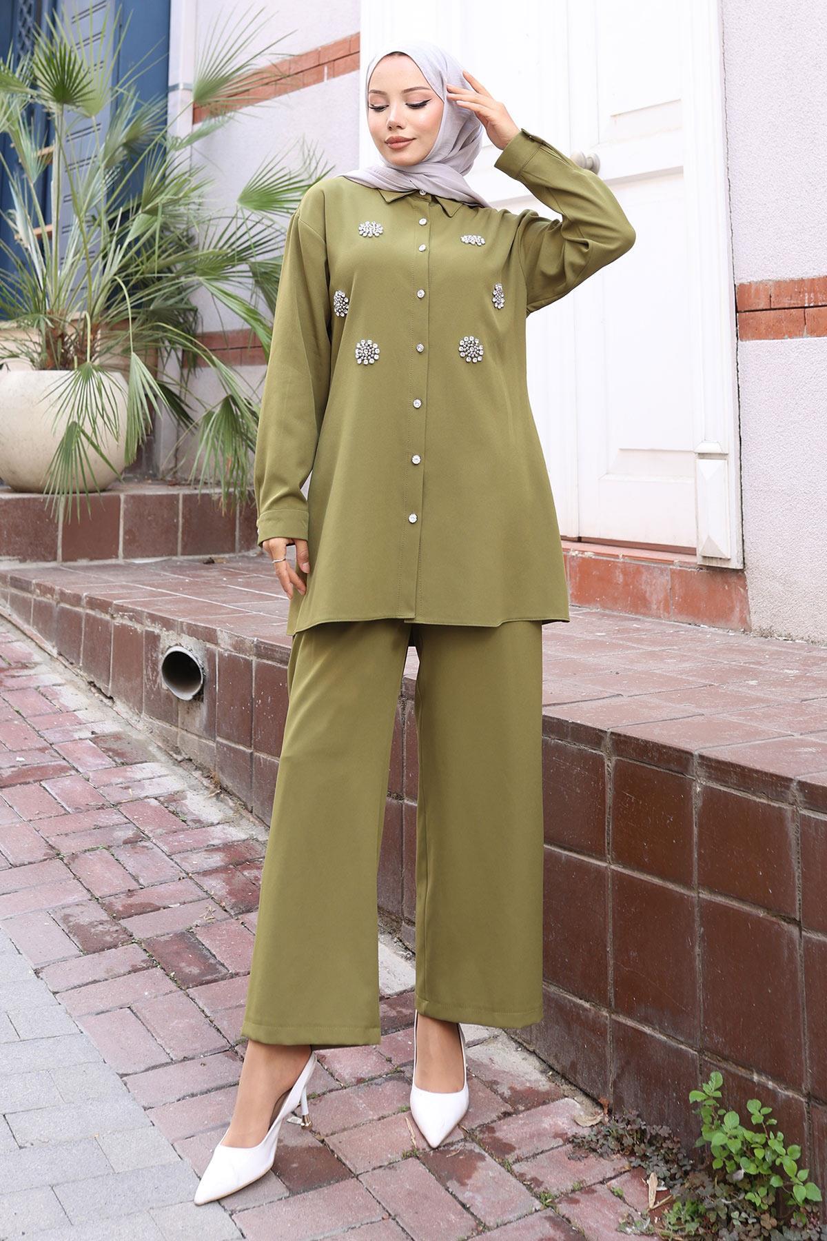 Ürün Özelliği : Yeni sezon tesettür moda ürünüdür. Astarsızdır. Tunik, önden kullanılabilir düğmeleri bulunmaktadır. Taşlar ve inciler baskıdır. Manşet düğmeleri aktiftir. Pantolon, beli arkadan lastiklidir. Cep mevcuttur. Ürün renginde konsept çekimlerinden dolayı ton farklılığı olabilir.